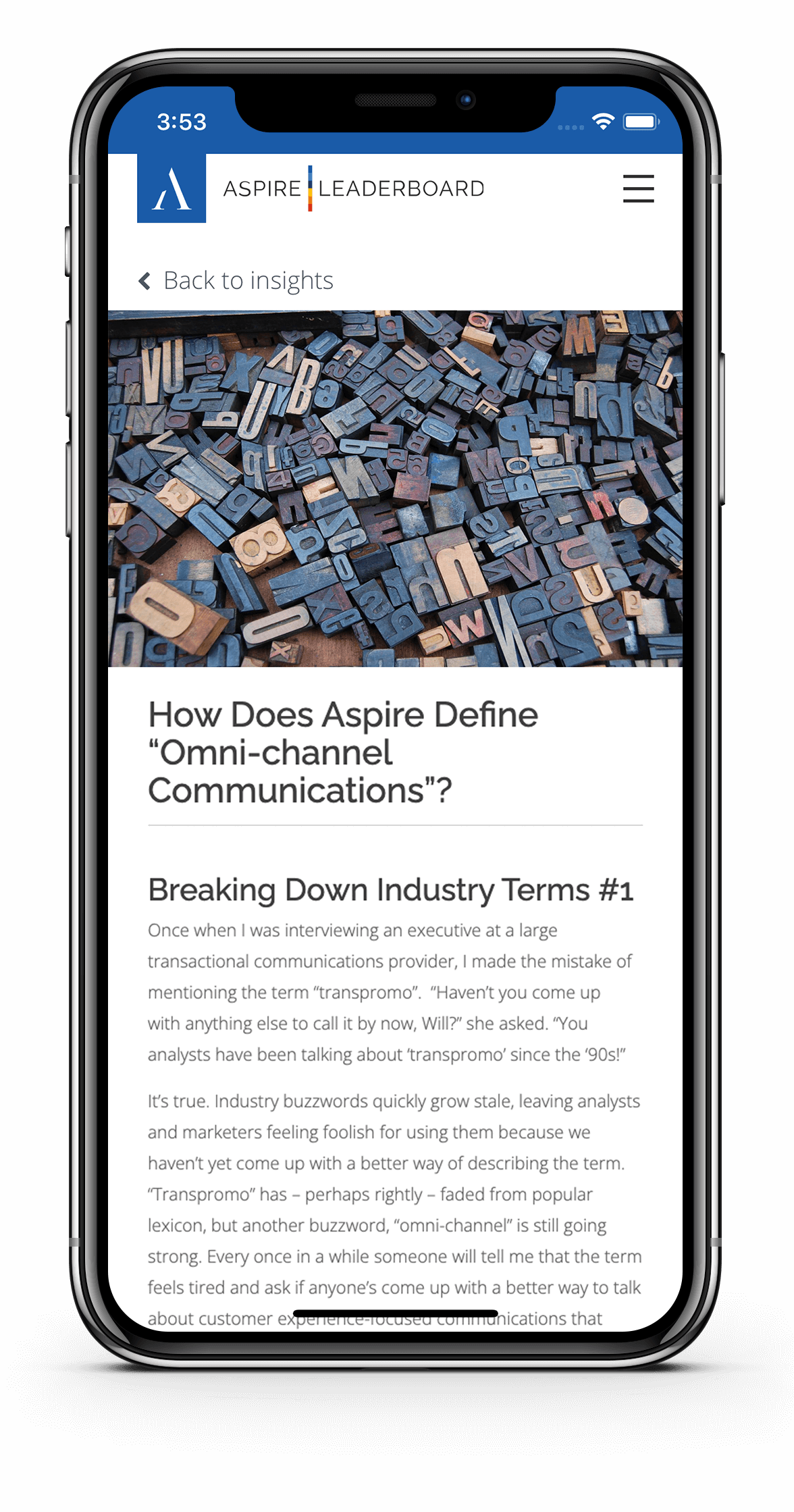 Aspire is a boutique consulting firm specializing in the Customer Communications Management (CCM) and Customer Experience Management (CXM) industries.