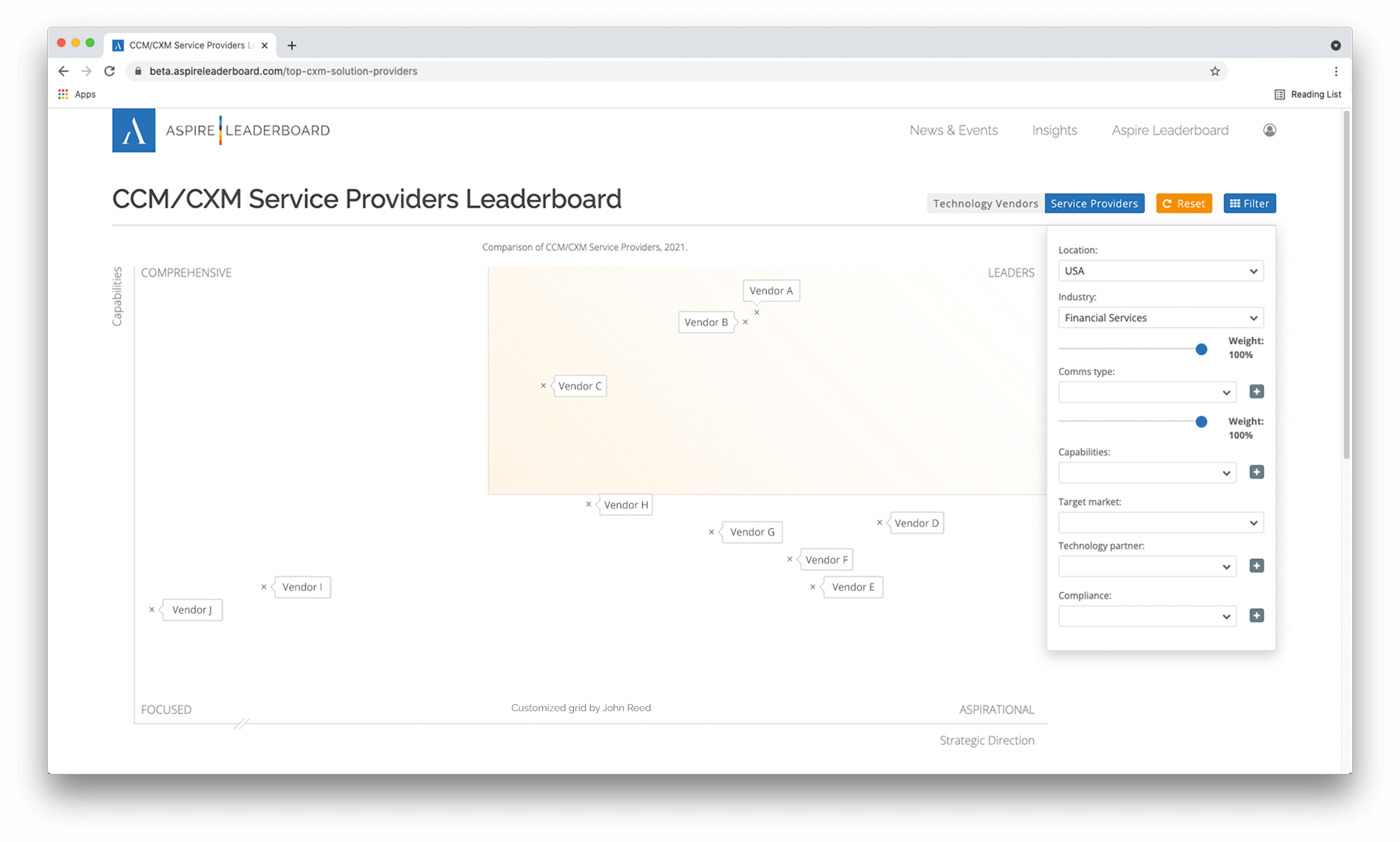 Access the gateway to a holistic understanding of the CCM and CXM markets with the Aspire Leaderboard; an interactive, digital-first comparison tool that dynamically visualizes the Technology Vendor and Service Provider landscape.